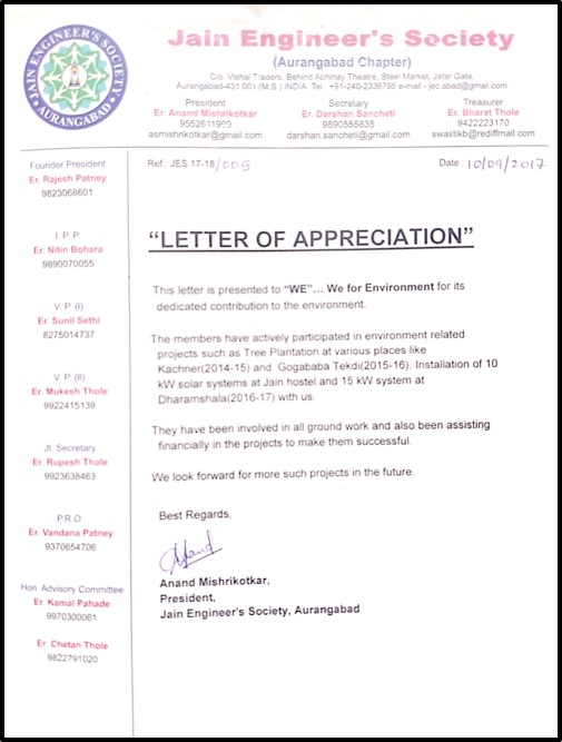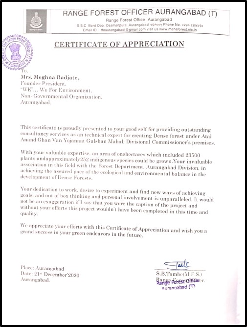 “We”…We for environment is a registered NGO working in creation of sustainable green cover, increase of social awareness about environmental conservation